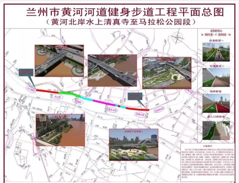 蘭州市黃河河道健身步道工程(黃河北岸水上清真寺至馬拉松公園段)位于黃河北岸河灘,全長2924.317米,西起黃河北岸金城關古建一條街水上清真寺,沿途經(jīng)過中山橋、元通黃河大橋、羅鍋溝洪道、音樂噴泉廣場、城關黃河大橋、大砂溝洪道、金雁黃河大橋至馬拉松公園。主要建設內(nèi)容包括人行步道、健身跑道、棧橋、照明工程、生態(tài)美化工程、相關配套設施及中山橋、元通大橋、金雁大橋下和音樂噴泉廣場節(jié)點景觀改造。