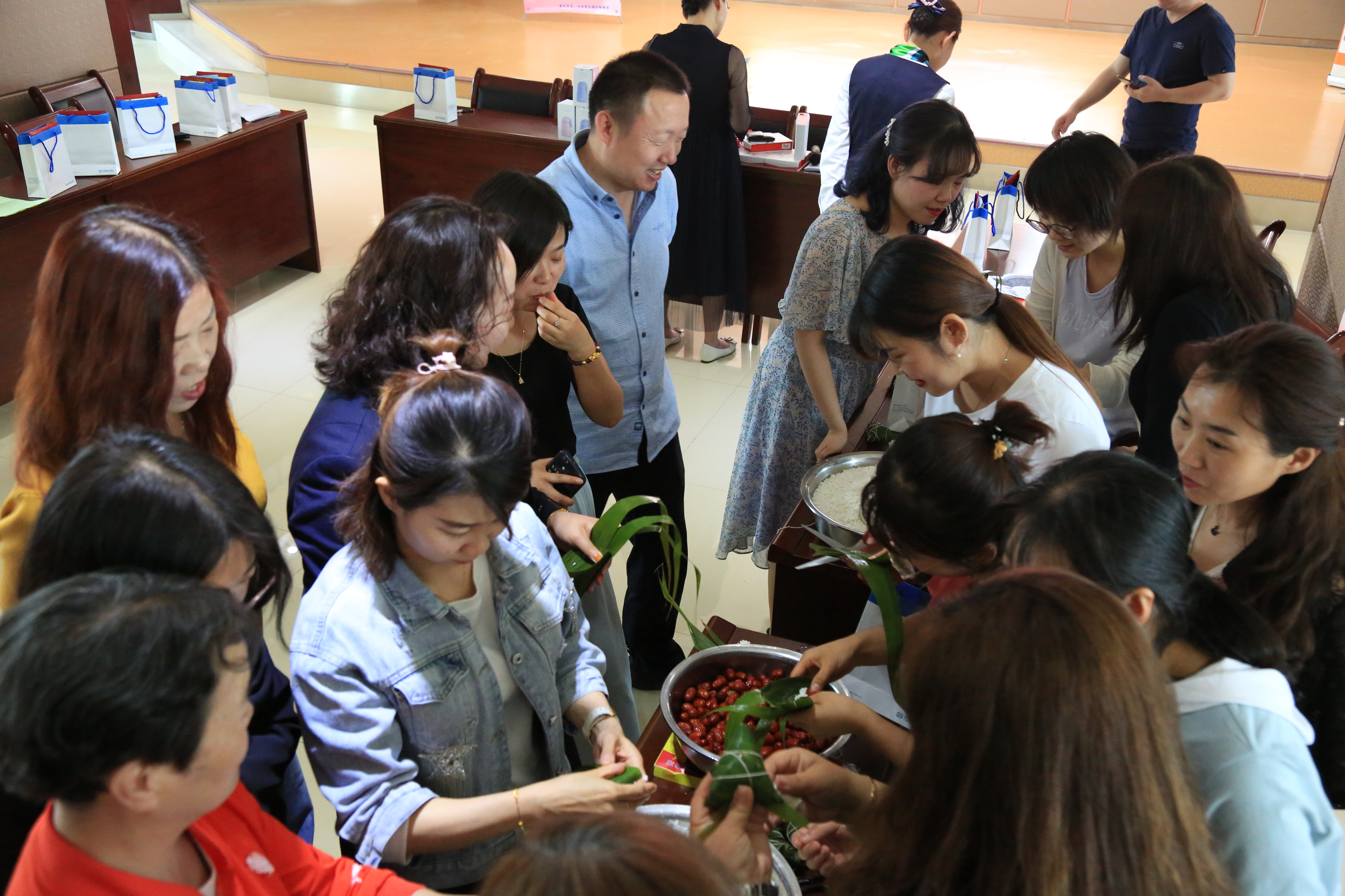 活動當天,伴隨著大家的歡聲笑語,包粽子比賽熱火朝天在濃厚的氣氛中開始,一片片棕葉、一顆顆紅棗、一個個包粽子達人們將活動現(xiàn)場氛圍推向一個又一個高潮。