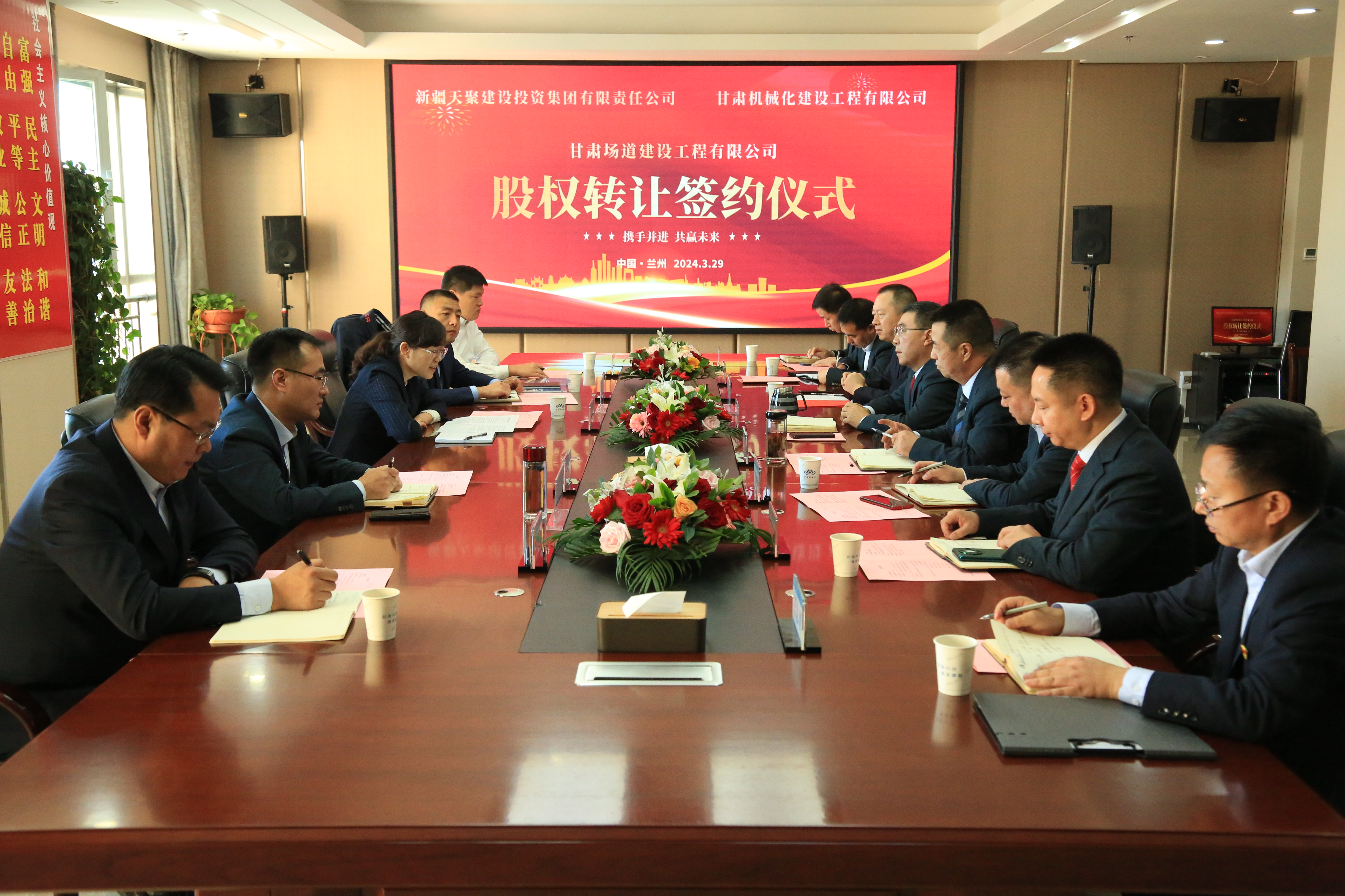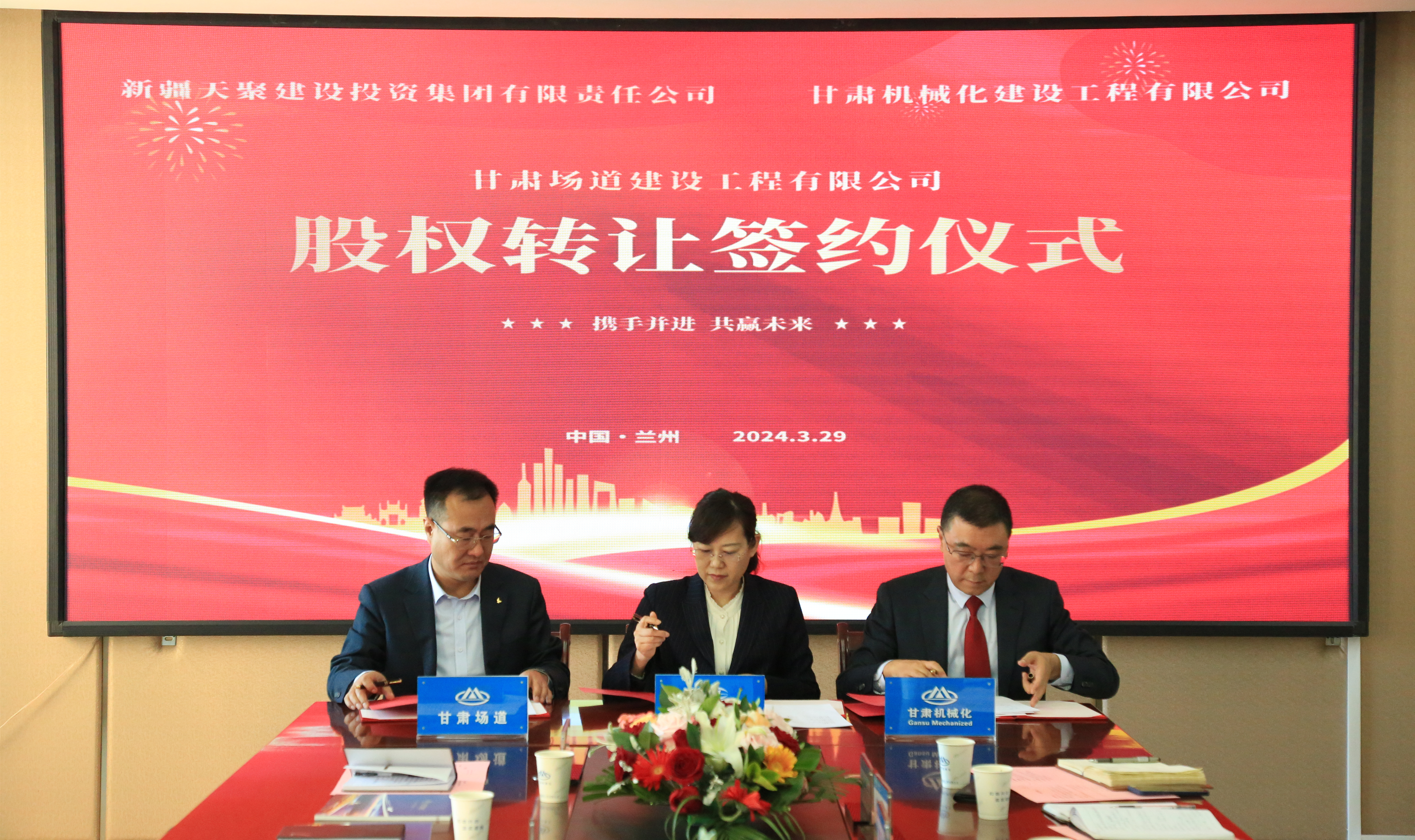 2024年3月29日,天聚建投集團(tuán)與我司在金城蘭州舉行了甘肅場道公司股權(quán)轉(zhuǎn)讓協(xié)議簽約儀式。